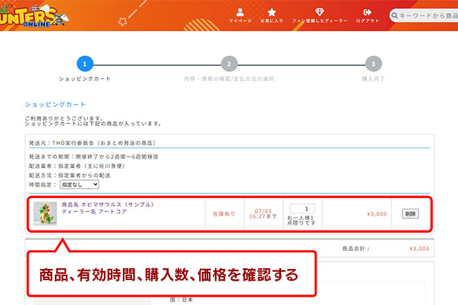 - カートに入った商品を確認して決済に進みます(有効時間あり)。