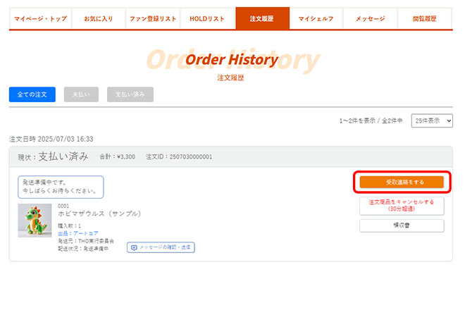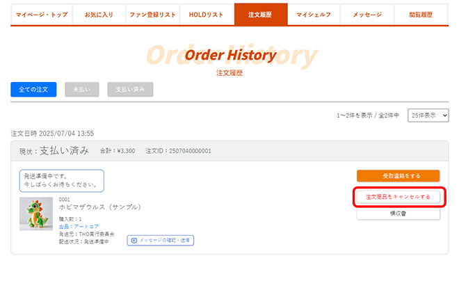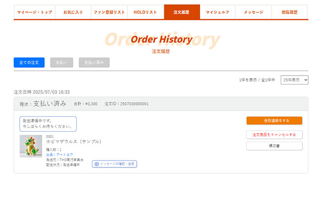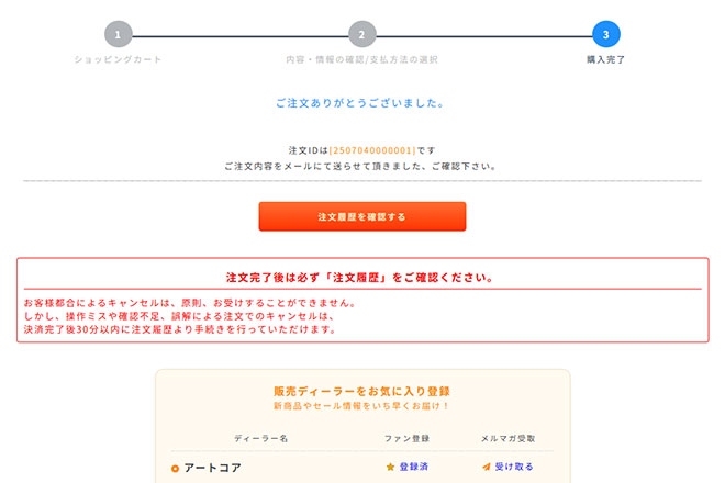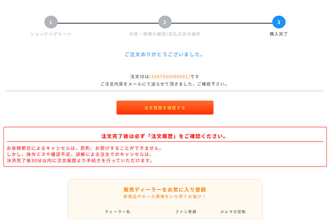- 注文履歴を確認して、注文した商品が記載されていれば購入完了です。