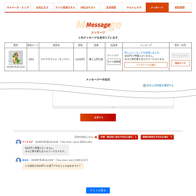 - メッセージで販売者と交渉して、10,000円の商品を8,000円にしてもらいました。