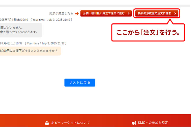 - 購入者は、メッセージ内「価格交渉成立で注文に進む」から「合意して注文する」を押して「正式な注文意思」を販売者に伝えます。