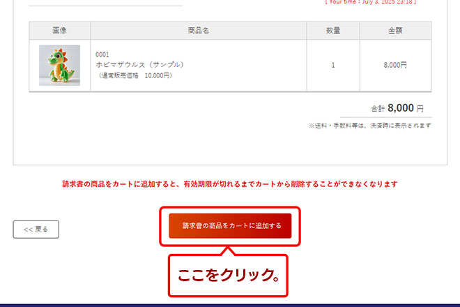 - 購入者は、特別決済の請求書から商品をカートに入れて、有効期限内に決済を行います。