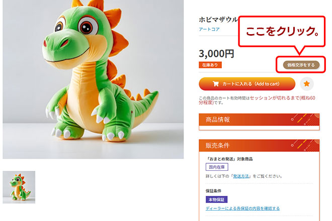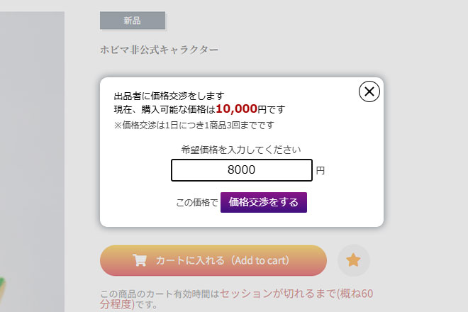 ②の 「メッセージによる交渉」 で値引きが成立した場合の購入方法は異なります。 (価格交渉の方法は 「価格交渉について」 をご覧ください) 例えば、商品ページで 10,000円 で売っている商品を価格交渉で 8,000円 にしてもらった場合、どのような方法で決済をすればよいかを説明いたします。